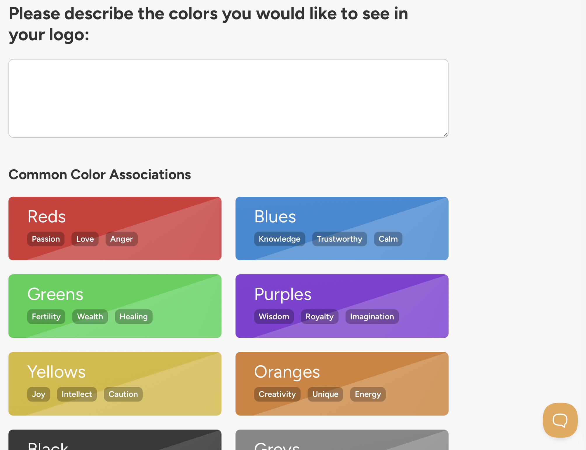 Describe the colors you would like for your brand. Common associations of each color in Western culture is listed. This is just a starting point. If you aren't sure what colors you would like you can ask designers to surprise you.