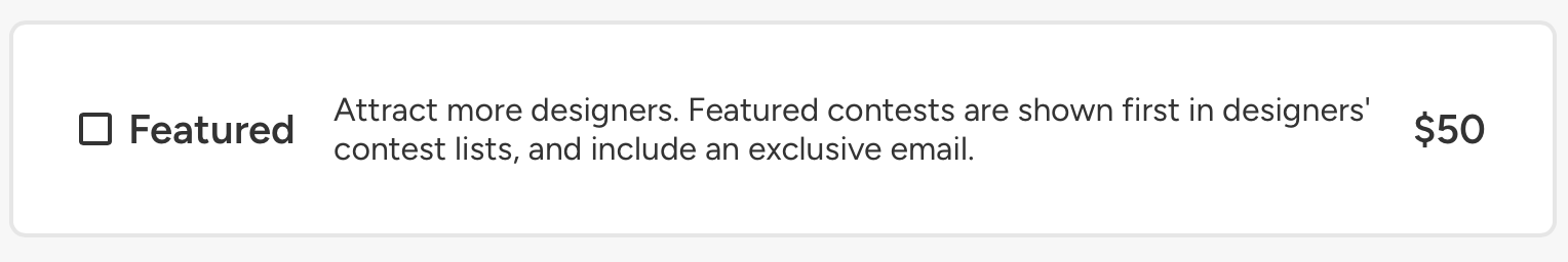 The Featured upgrade will attract more designers by showing featured contests at the top, and include an exclusive email. The Featured upgrade costs $50 USD.