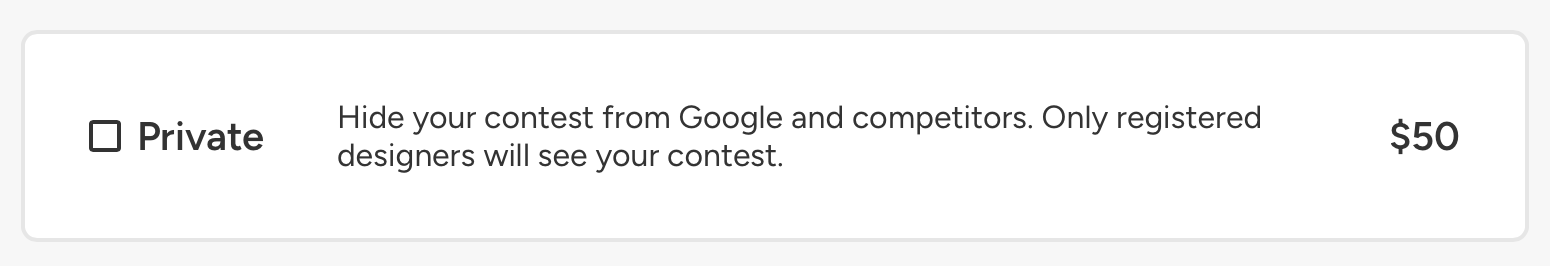 The Private upgrade will hide your contest from everyone except approved LogoTournament designers. This hides your contest from search engines like Google and competitors with prying eyes. The upgrade costs $50 USD.
