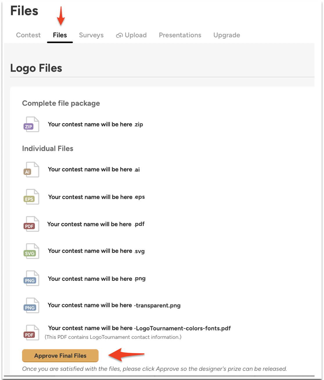 - Once you have downloaded the final files you can approve them. This will transfer the prize to the winning designer.